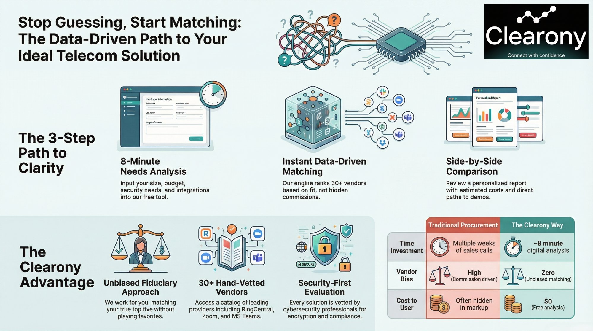 Take the 8-minute needs analysis. Get a personalized vendor report. Move forward with Clearony-negotiated pricing and full advisor support — at zero cost to you.